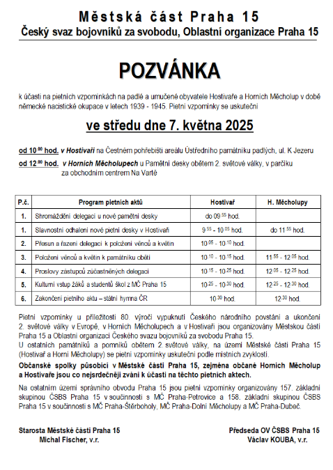 25. října 2024 ve 10.00 - Pietní vzpomínka na padlé, u příležitosti 106. výročí ukončení I. světové války a vzniku samostatného Československa - pietní vzpomínka u památníku obětem II. světové války v Hostivaři na Čestném pohřebišti, ul. K Jezeru