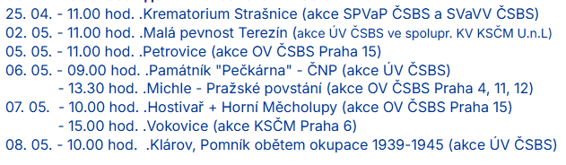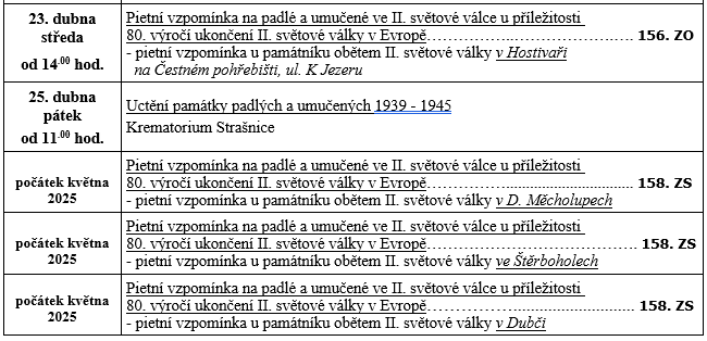 24. dubna 2024 - Pietní vzpomínka na padlé a umučené ve II. světové válce u příležitosti 79. výročí ukončení II. světové války v Evropě v Horních Měcholupech, Petrovicích a Hostivaři, Dolních Měcholupech, Dubči a Štěrboholech