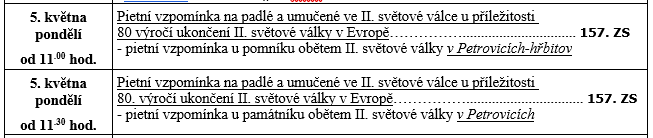 27. října 2024 v 10.00 - Pietní vzpomínka na padlé, u příležitosti 106. výročí ukončení I. světové války a vzniku samostatného Československa. Pietní vzpomínka u pamětní desky obětem II. světové války v Petrovicích - hřbitov