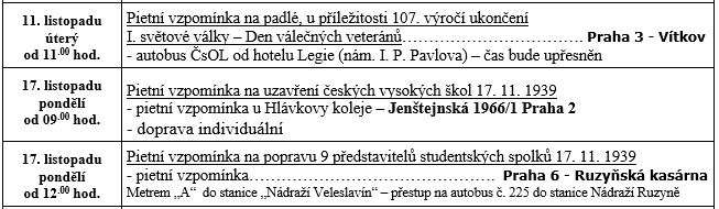 17. listopadu 2024 - 9.00 - Pietní vzpomínka na uzavření českých vysokých škol 17. 11. 1939 - pietní vzpomínka u Hlávkovy koleje - Jenštejnská 1966/1 Praha 2